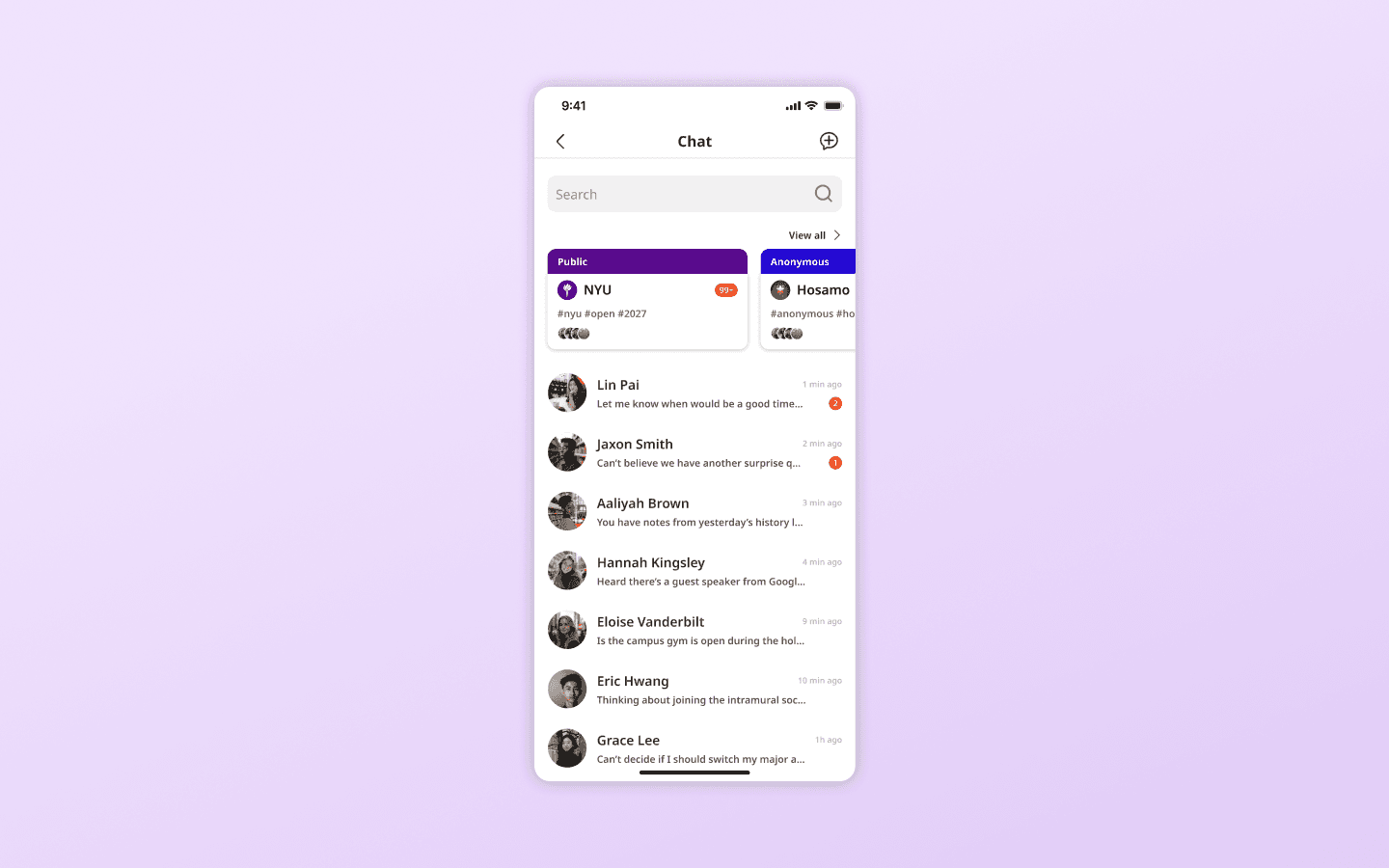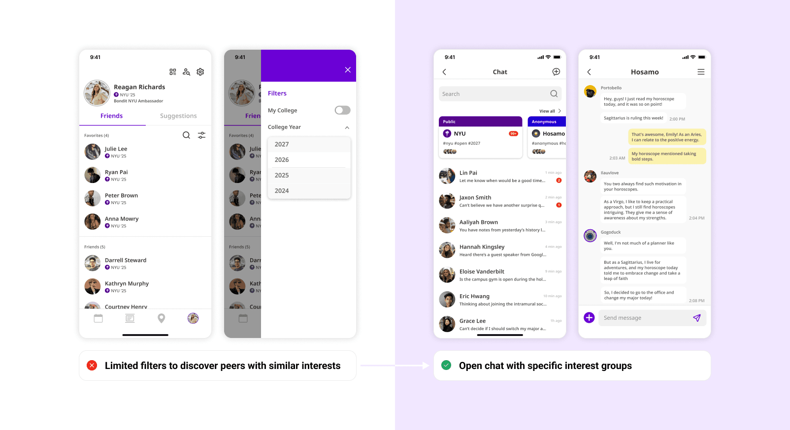 Users can bond with college peers of similar interests by joining open group chats of specific interests